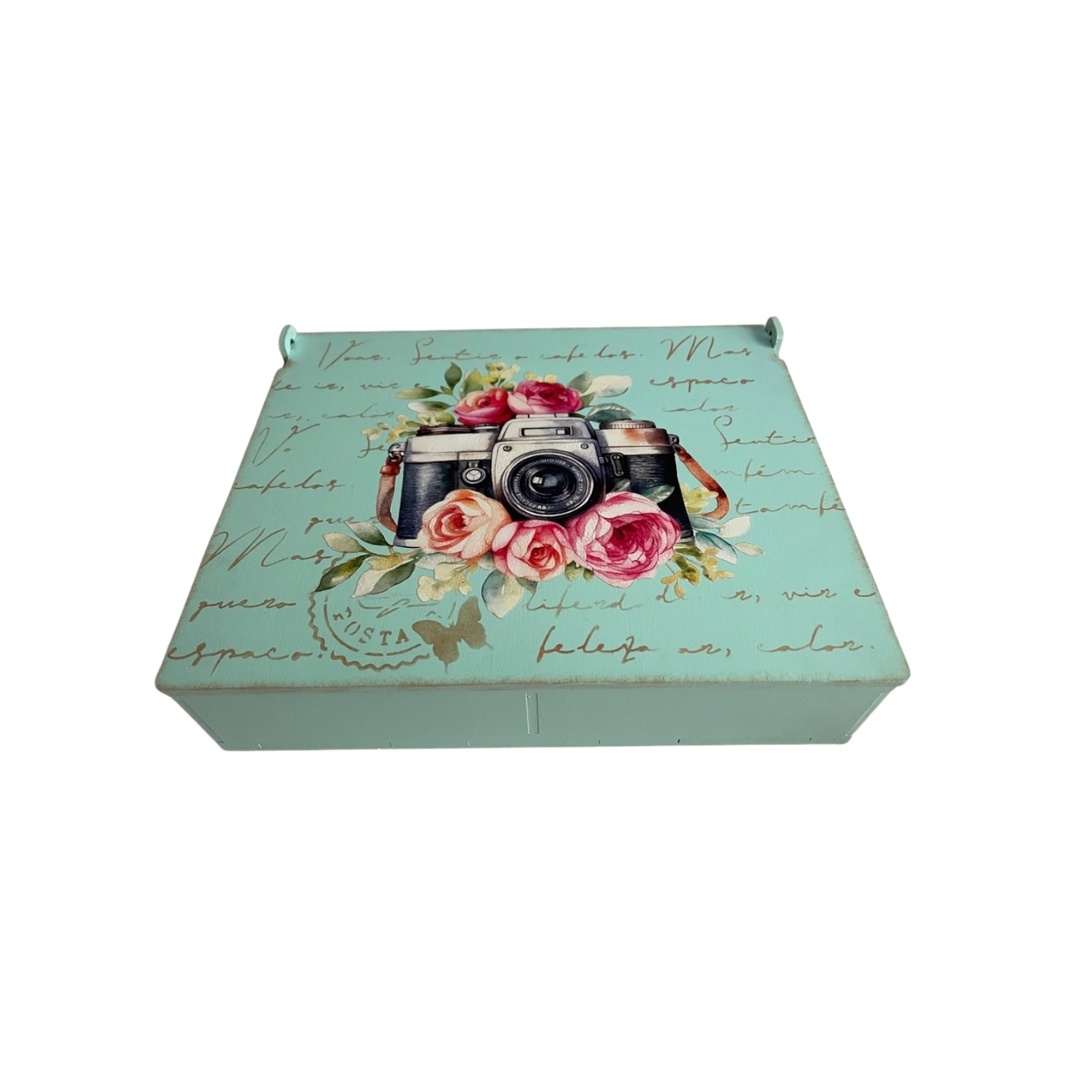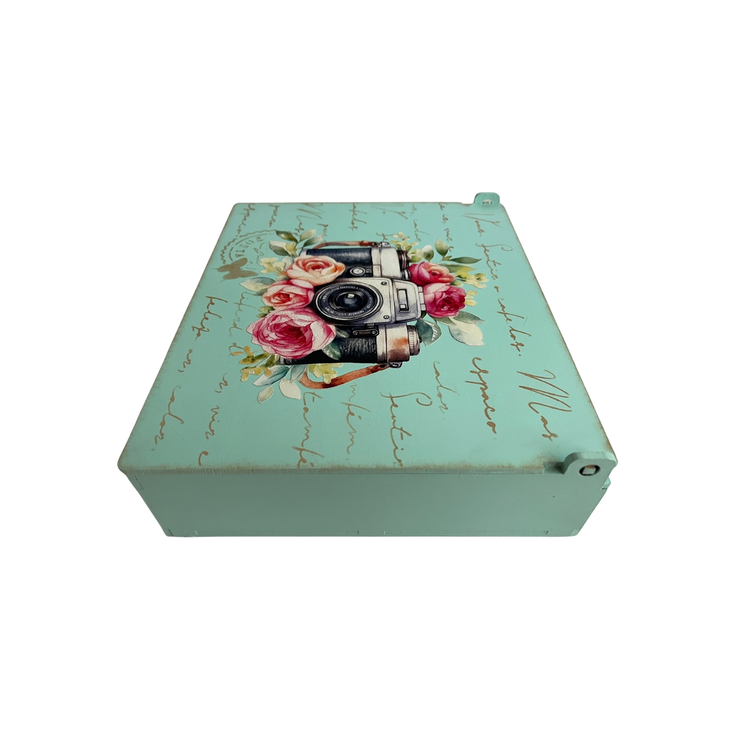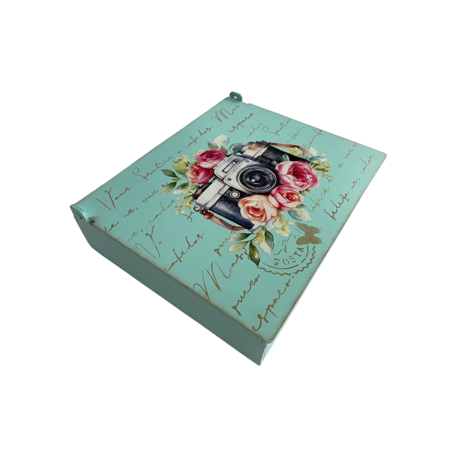 Hermosa caja organizadora artesanal para fotografías, elaborada en madera MDF y decorada cuidadosamente a mano. Su diseño presenta una cámara vintage rodeada de flores, sobre un fondo en tono pastel que transmite elegancia y delicadeza.