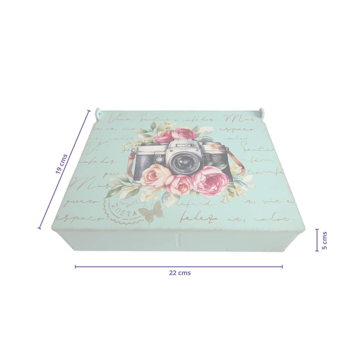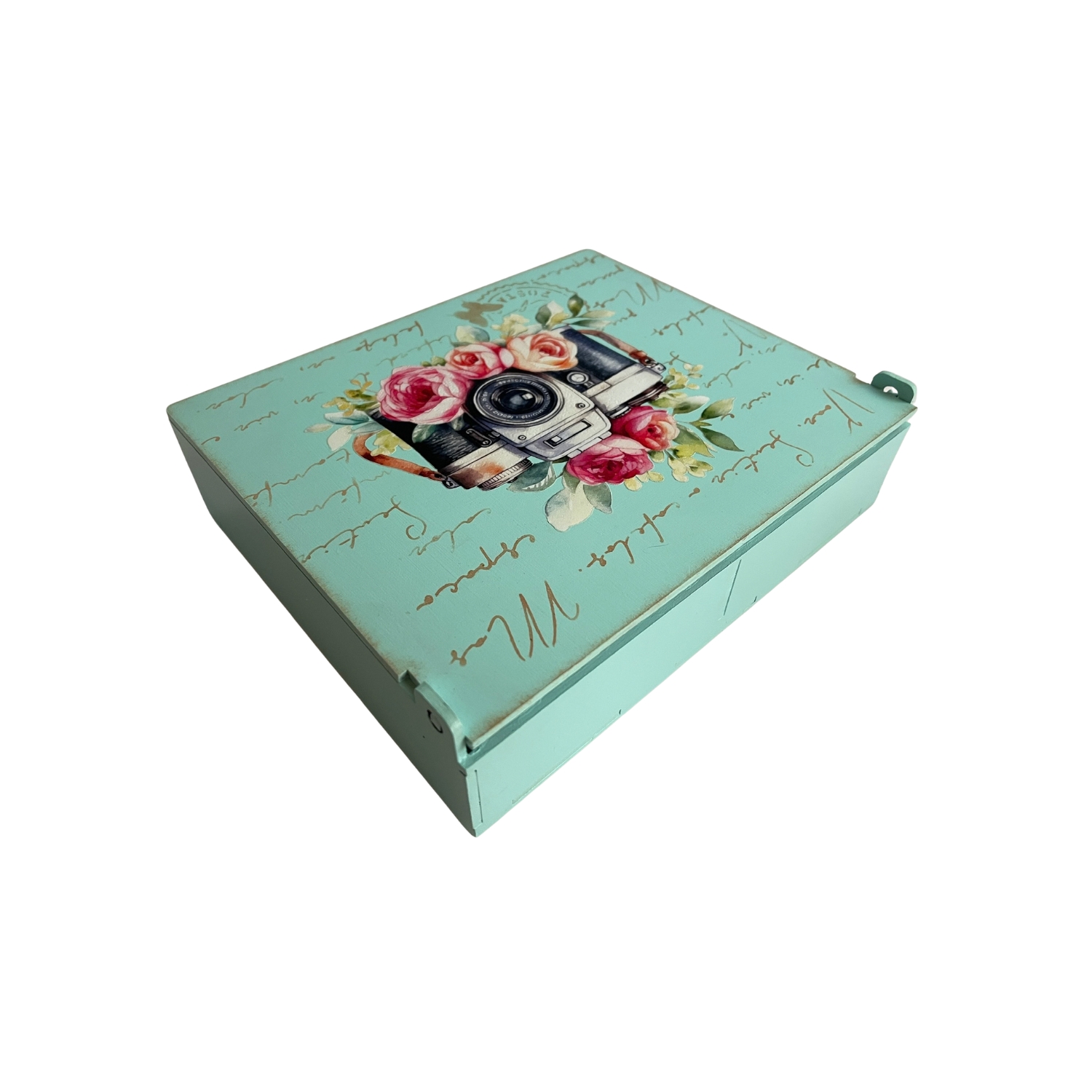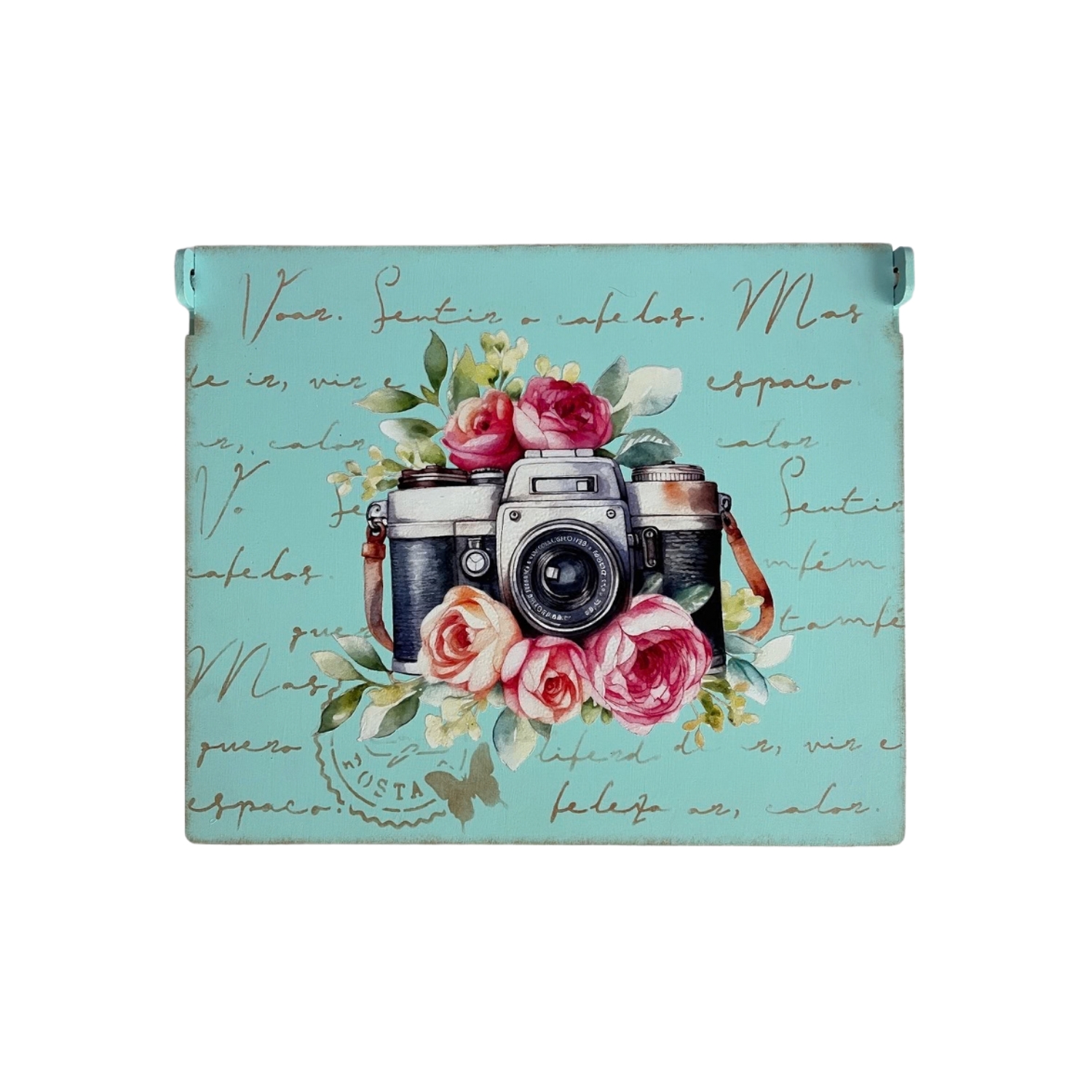 Hermosa caja organizadora artesanal para fotografías, elaborada en madera MDF y decorada cuidadosamente a mano. Su diseño presenta una cámara vintage rodeada de flores, sobre un fondo en tono pastel que transmite elegancia y delicadeza.