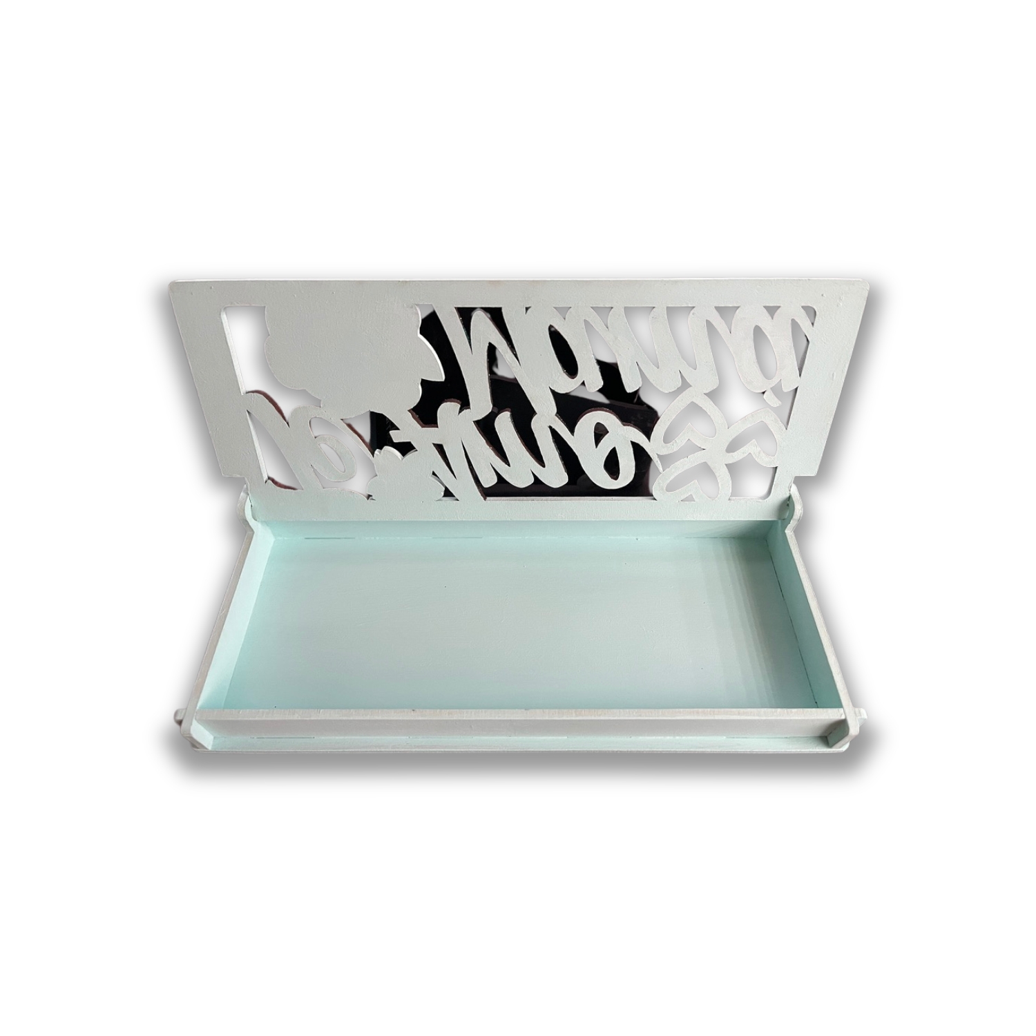 Fabricada en madera MDF, esta cajita es ideal tanto como elemento decorativo como funcional, permitiendo guardar pequeños objetos, recuerdos o accesorios.