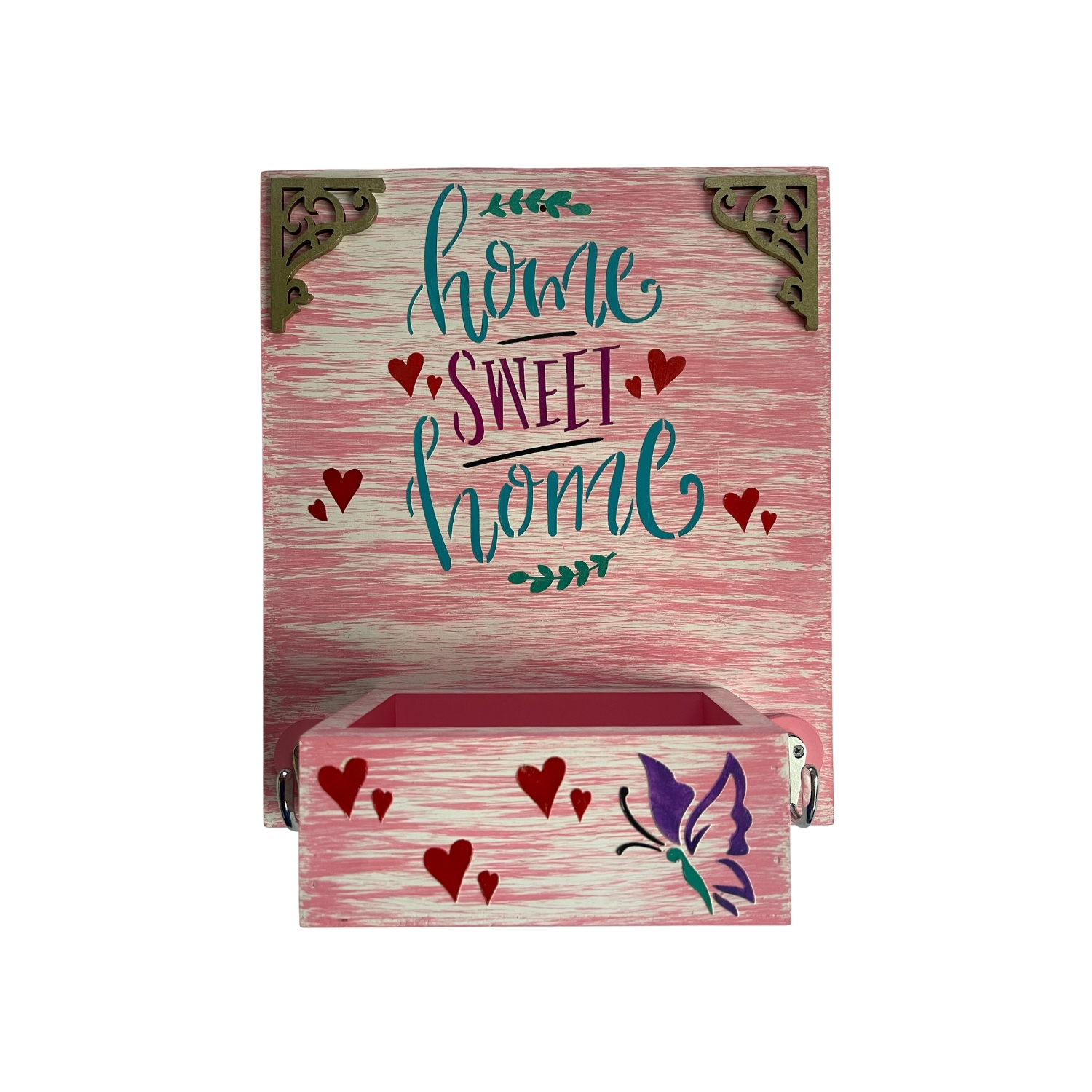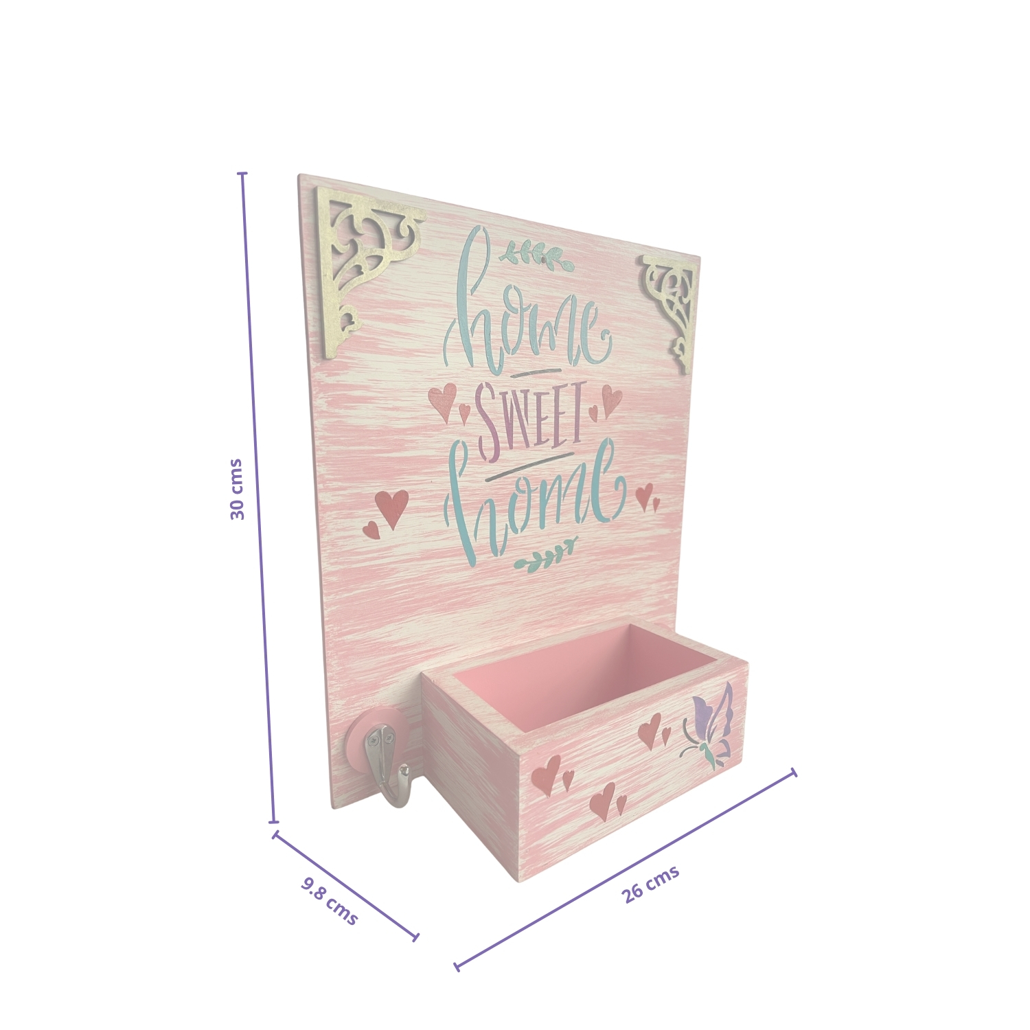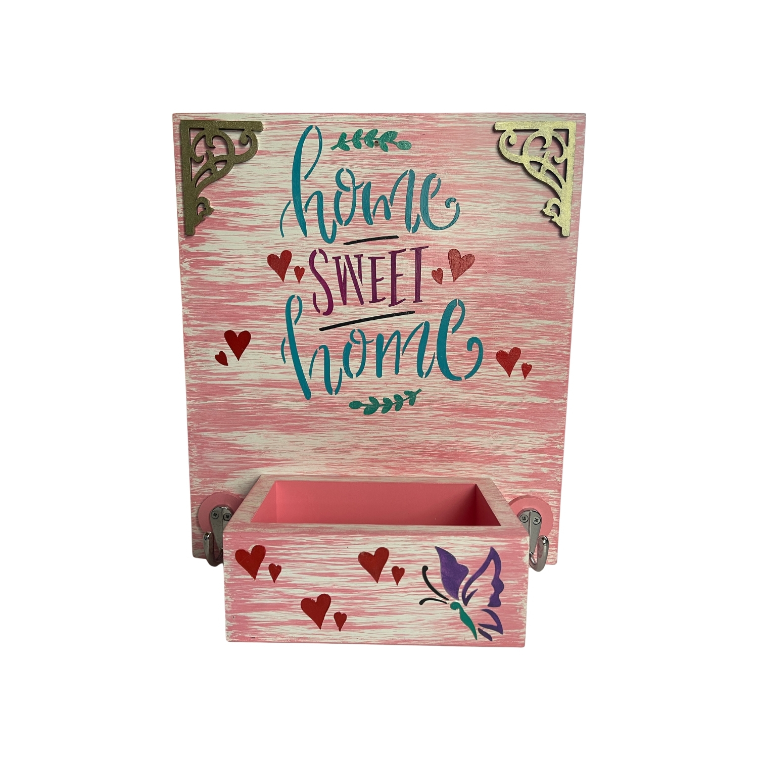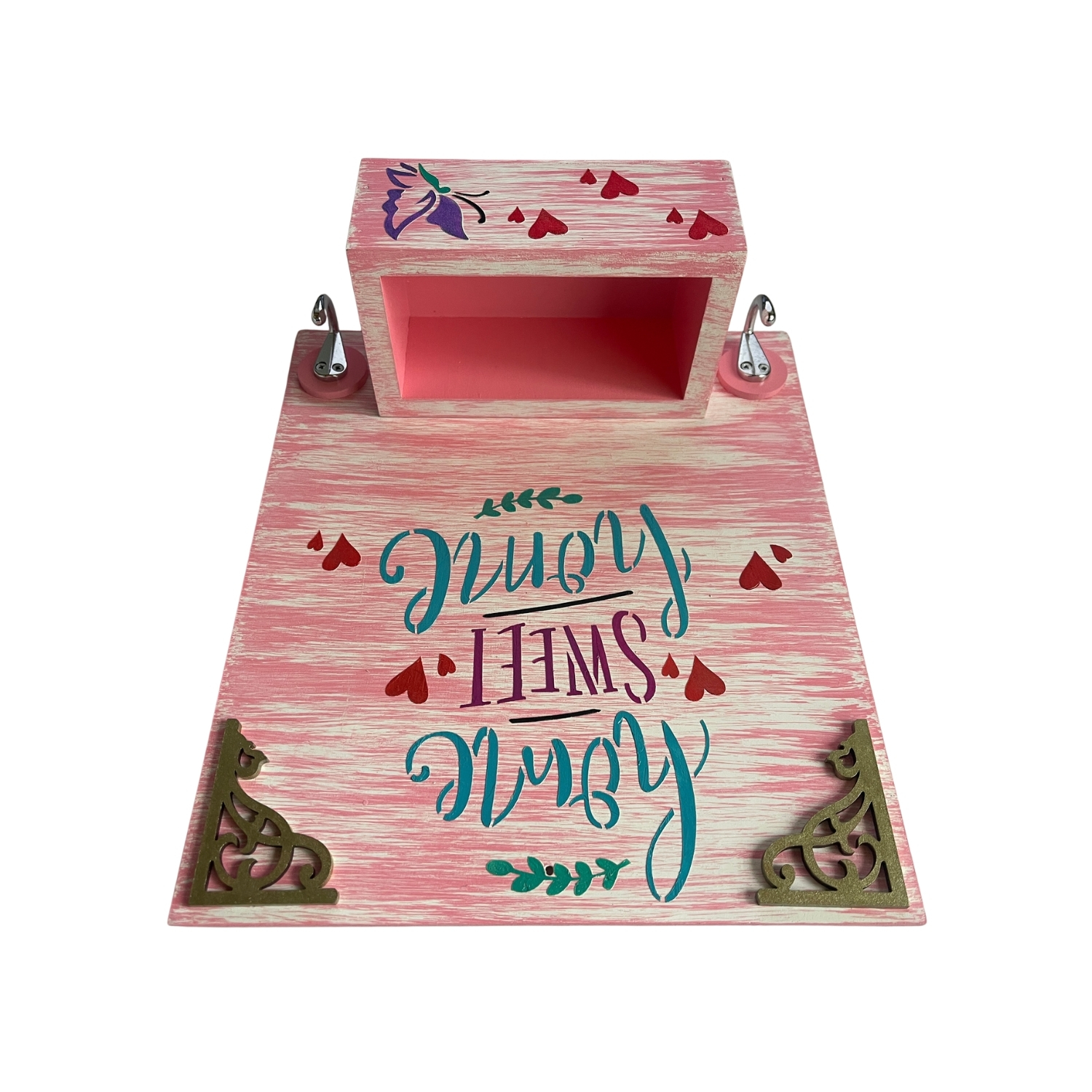 - Su diseño decorativo con la frase “Home Sweet Home”, acompañado de detalles en corazones y una mariposa, lo convierte en una pieza ideal para ubicar en la entrada del hogar, aportando un ambiente acogedor y personalizado.