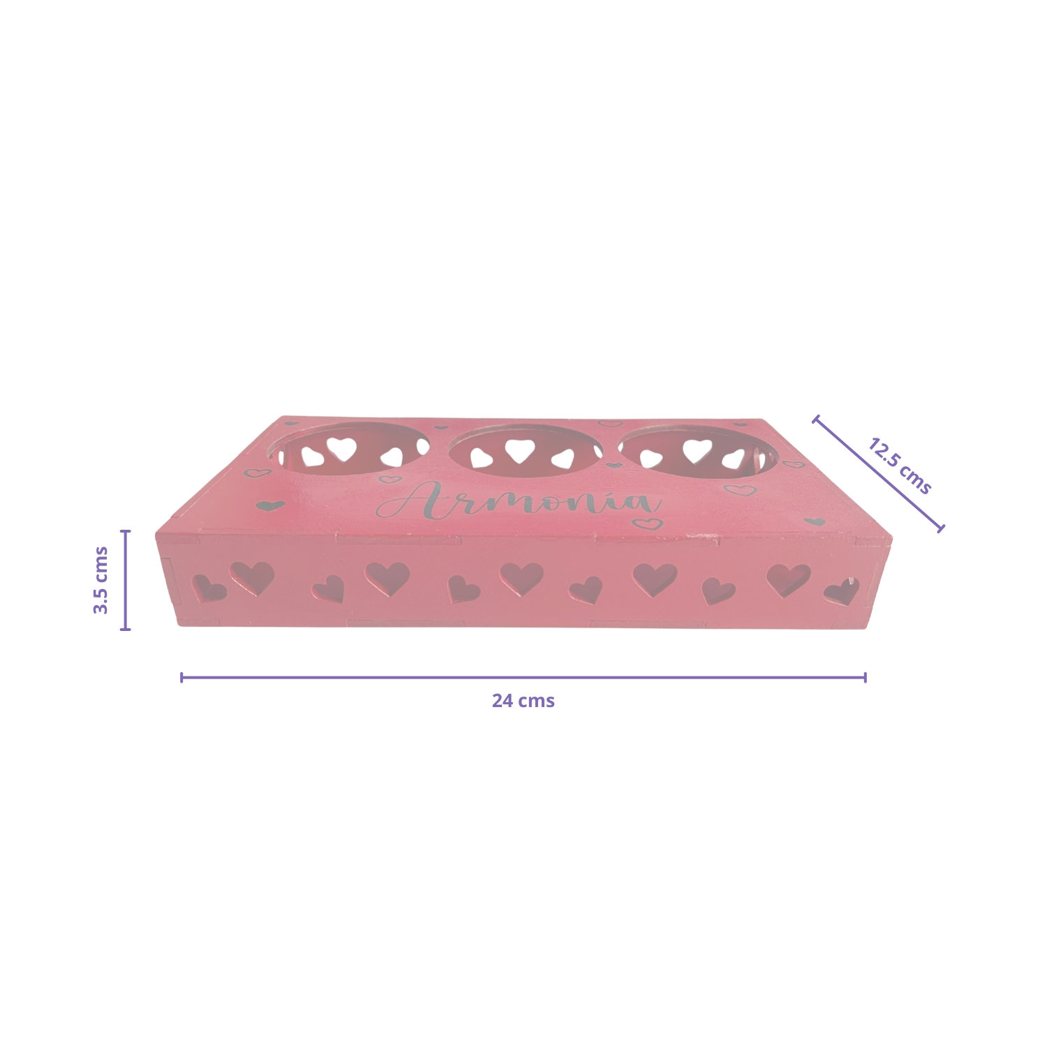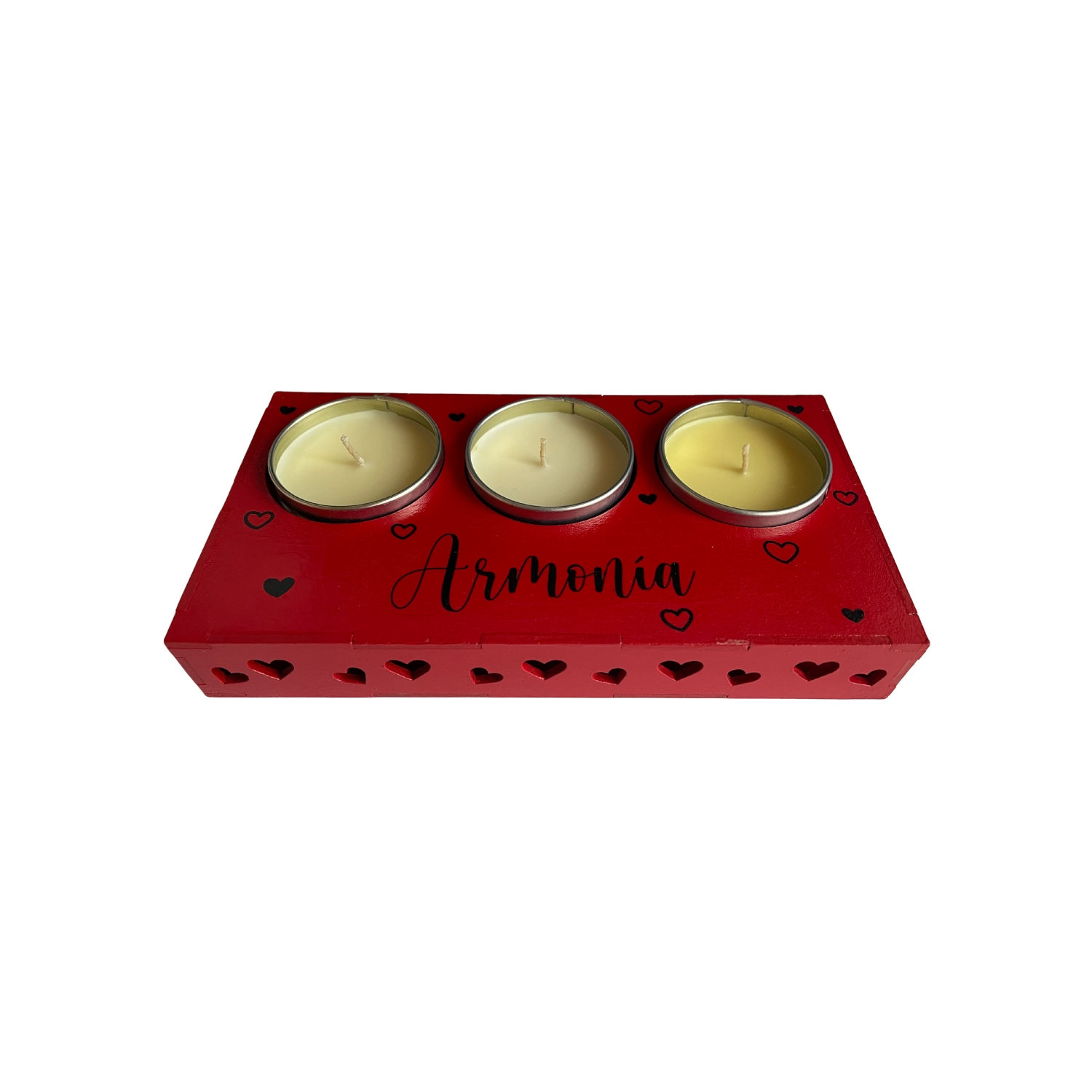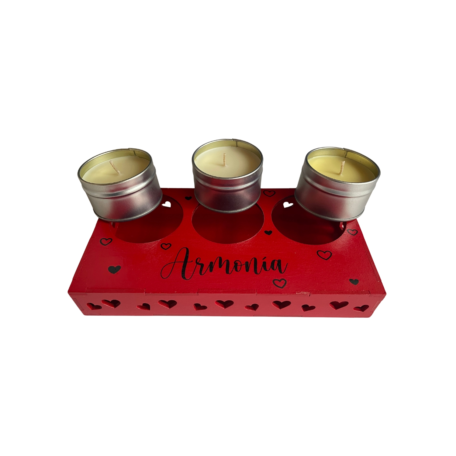 Su diseño en tono rojo con detalles de corazones y la palabra “Armonía” lo convierte en una pieza decorativa ideal para espacios románticos, salas, habitaciones o incluso como centro de mesa.