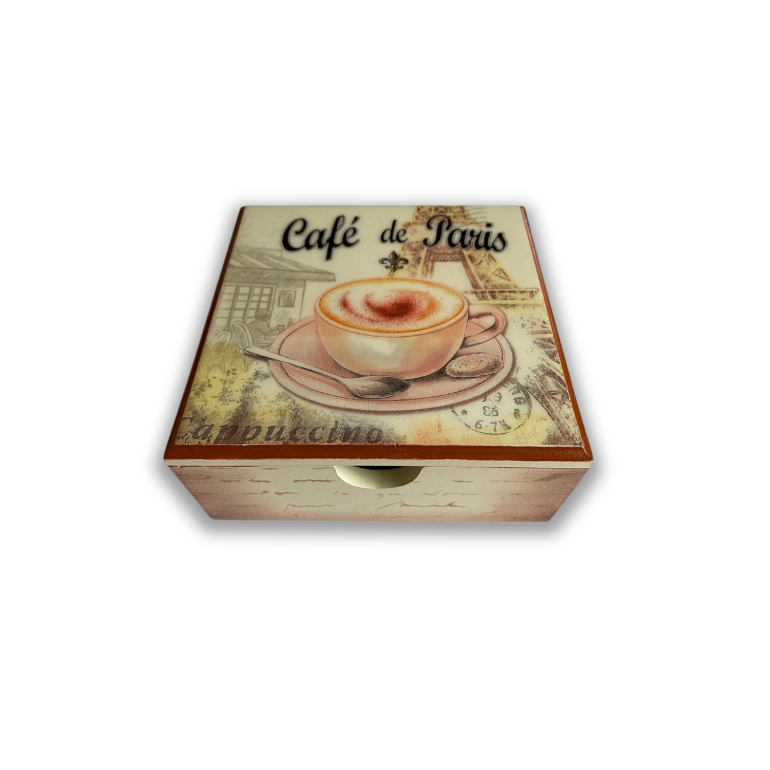 Caja organizadora en madera MDF y resina con diseño vintage inspirado en café parisino, perfecta para decorar y almacenar con estilo.